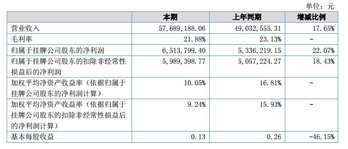 公司在報(bào)告期內(nèi)的主營(yíng)業(yè)務(wù)收入為57,689,188.06元,比上年度同期增長(zhǎng)8,656,632.75元;營(yíng)業(yè)成本為45,067,825.96元,比上年度同期增長(zhǎng)7,375,962.93元;歸屬于母公司的凈利潤(rùn)為6,513,799.40元,比上年度同期增長(zhǎng)1,177,580.25元。?