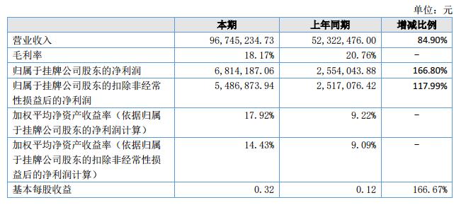 公司在報告期內(nèi)的主營業(yè)務(wù)收入為96,745,234.73元,較去年同期增長44,422,758.73元,增幅84.90%;成本及費用90,373,766.29元,較去年同期增長41,100,857.46元,增幅83.42%,歸屬于母公司的凈利潤為6,814,187.06元,較去年同期增加4,260,143.18元,增幅166.80%。?