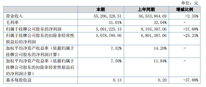 報告期內(nèi),公司實現(xiàn)營業(yè)收入5,520.63萬元,與上年同期相比減少了2.35%;營業(yè)總成本4,979.49萬元,與上年同期相比增加0.56%;實現(xiàn)凈利潤509.12萬元,與上年同期相比減少了37.88%。?