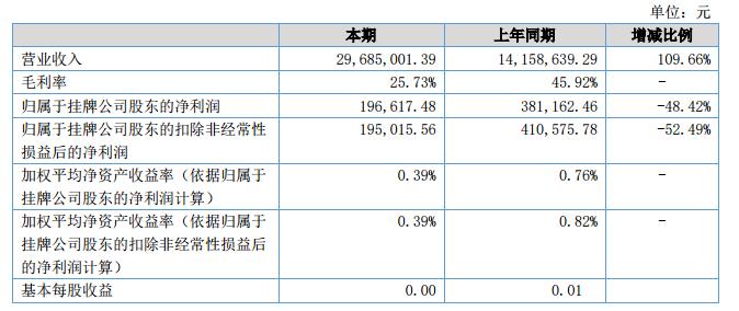 報(bào)告期內(nèi),公司的營(yíng)業(yè)總成本為2,956.82萬(wàn)元,與上年同期營(yíng)業(yè)成本1,444.07萬(wàn)元相比,增加了 1,512.75萬(wàn)元,增幅為104.76%;毛利率為25.73%,與上年同期45.92%相比,毛利率下降了20.19%,;公司實(shí)現(xiàn)凈利潤(rùn)14.95萬(wàn)元,與上年同期-52.99萬(wàn)元相比增加了67.94萬(wàn)元。?