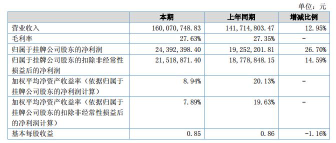 報告期內實現(xiàn)營業(yè)收入160,070,748.83元,同比增長12.95%,實現(xiàn)凈利潤24,392,398.40元,同比增長26.70%,主要是公司通過積極根據(jù)客戶需求研發(fā)新產品,調整產品結構。相比上年同期增加了大健康類業(yè)務,實現(xiàn)收入6,535,441.88元。?