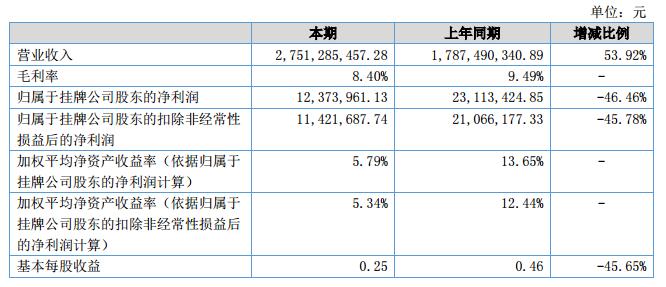報(bào)告期內(nèi),公司實(shí)現(xiàn)營(yíng)業(yè)收入2,751,285,457.28元,較上年同比增長(zhǎng)53.92%;實(shí)現(xiàn)營(yíng)業(yè)成本2,520,264,668.20元,較上年同比增長(zhǎng)55.78%;實(shí)現(xiàn)凈利潤(rùn)12,373,961.13元,較上年同比增長(zhǎng)-46.46%。