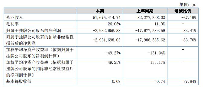 報告期內,公司營業(yè)收入全部為主營業(yè)務收入,收入額為51,675,414.74元,同比下降37.19%。成本為38,216,005.76元,同比下降47.28%。凈利潤為-2,894,687.25元,同比上升83.71%。經營性現(xiàn)金凈流量為-12,573,989.89元,同比上升53.01%。?