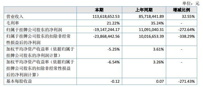 公司在報告期內的主營業(yè)務收入為113,618,652.53元,同比上年度增長32.55%;營業(yè)成本為89,513,290.01元,同比上年度增長61.26%;歸屬于母公司的凈利潤為-19,147,244.17元,同比上年變動率為-272.64%。?