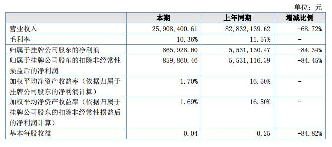 2018年上半年實(shí)現(xiàn)營(yíng)業(yè)收入2,590.84萬,較去年同期減少68.72%,實(shí)現(xiàn)凈利潤(rùn)86.59萬元,較去年同期減少84.34%。?