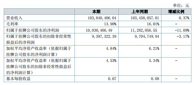 報(bào)告期內(nèi),公司實(shí)現(xiàn)營業(yè)收入103,840,406.04元,較上年同期103,458,057.01元增長0.37%,公司銷售收入較為穩(wěn)定;報(bào)告期內(nèi),公司毛利率為13.90%,較上年同期的16.01%略有下降,主要原因系受公司主要原材料蓮子價(jià)格上漲的影響,公司采購成本上升。報(bào)告期內(nèi),公司實(shí)現(xiàn)凈利潤10,030,406.49元,較上年同期11,282,056.55元減少1,251,650.06元,主要原因系公司本期營業(yè)收入較上期基本持平,但隨著公司產(chǎn)品毛利率的下降,公司營業(yè)毛利減少:公司本期營業(yè)毛利較上年同期減少2,130,363.79元。?