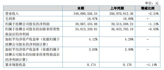 報告期內公司實現(xiàn)營業(yè)收入34,808.06萬元,同比下降2.24%;營業(yè)成本28,239.61萬元,同比下降2.24%。實現(xiàn)歸屬于掛牌公司股東的凈利潤3,906.74萬元,同比下降1.13%;基本每股收益0.174,同比下降1.14%。