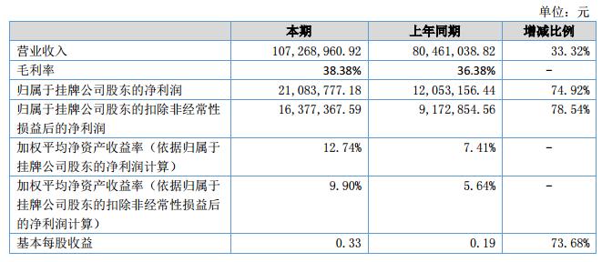 報(bào)告期內(nèi)公司財(cái)務(wù)狀況良好,營(yíng)業(yè)收入大幅增加,盈利能力明顯增強(qiáng),現(xiàn)金流充足,資產(chǎn)負(fù)債率低。報(bào)告期內(nèi),公司實(shí)現(xiàn)營(yíng)業(yè)收入10,726.90萬元,較上年同期增加2,680.80萬元,同比增長(zhǎng)33.32%;實(shí)現(xiàn)凈利潤(rùn)2,102.70萬元,較上年同期增加899.90萬元,同比增長(zhǎng)74.82%。?