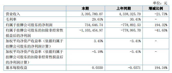 2018年1-6月份實現(xiàn)銷售收入3,395,780.07元,比上年同期4,338,325.79元減少942,545.72元,較去年同期減少21.73%。主要原因是公司在國家環(huán)保力度增加,客戶經(jīng)營環(huán)境變化,造成了上半年度客戶購買力的下降所致。2018年1-6月份發(fā)生營業(yè)成本2,373,106.84元,比上年同期2,818,608.27元減少445,501.43元,較去年同期下降15.81%。主要是銷售額減少引起的成本減少。2018年1-6月實現(xiàn)凈利潤457,191.34元,比去年同期凈利潤-889,779.61元增加1,346,970.95元,較去同期增加151.38%。主要原因是報告期內(nèi)公司母公司收到三板上市政府補貼2,500,000.00元,營業(yè)外收入大幅增加,增厚了公司凈利潤。?