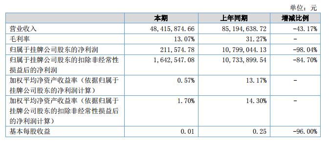 2018年上半年實(shí)現(xiàn)營業(yè)收入4,841.59萬元,同比減少43.17%。公司2018年上半年?duì)I業(yè)成本為4,208.86萬元,同比減少28.11%。公司2018年上半年綜合毛利率為13.07%,較上年同期減少了18.21個百分點(diǎn)。公司實(shí)現(xiàn)凈利潤21.16萬元,較上年同期減少1,058.75萬元。?