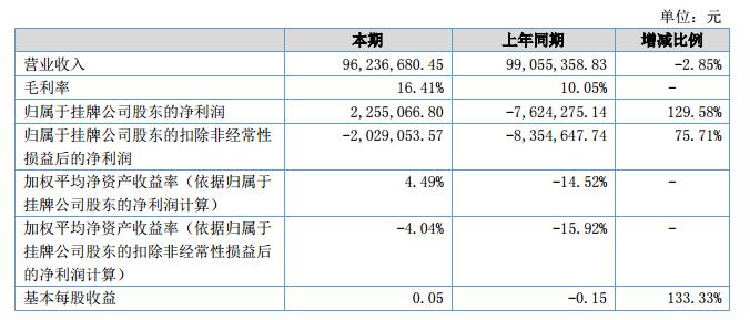 2018年上半年公司營業(yè)收入9,623.67萬元,比上年同期的9,905.54萬元下降了2.85%。本期毛利率為16.41%,上年同期的毛利率10.05%有了較大幅度地上升。報告期內(nèi),公司的凈利潤為225.51萬元,同比上升了129.58%。
