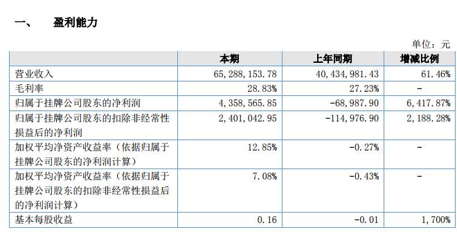 報(bào)告期內(nèi),公司資產(chǎn)總額 222,079,050.32 元,較年初增加 3,448,903.07 元,增幅 1.58%;本期負(fù)債總額為 185,967,897.89 元,較年初減少 909,622.78 元,減幅 0.49%;本期凈資產(chǎn)總額 36,111,152.43 元,較年初增加 4,358,565.85 元,增幅 13.73%;本期營業(yè)收入 65,288,153.78 元,較上年同期增加 24,853,172.35 元,增幅 61.46%;本期營業(yè)成本 46,467,082.87 元,較上年同期增加 17,041,153.98 元,增幅 57.91%,本期凈利潤 4,358,565.85 元,較上年同期增加 4,427,553.75 元,增幅 6,417.87%,本期經(jīng)營活動產(chǎn)生的現(xiàn)金流量凈額 21,269,168.07 元,較上年同期增加 12,733,523.51 元,增幅 149.18%。
