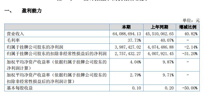 2018 年上半年公司簽訂的合同保持穩(wěn)定,實現營業(yè)收入 6,408.87 萬元,營業(yè)成本 3,990.74 萬元,凈利潤 398.74 萬元;上年同期營業(yè)收入 4,551.01 萬元,營業(yè)成本 2,727.48 萬元,凈利潤 407.45 萬元;本期與上年同期相比分別增長 40.82%、46.32%及-2.14%。營業(yè)收入與去年同期增長較大的主要原因是本報告期的生產經營規(guī)模較去年擴大,完工驗收項目比去年同期增多;營業(yè)成本增加較多的主要原因是原材料成本及直接人工成本上升;凈利潤下降的主要原因是制造成本增長,員工增加及工資水平上升導致期間費用增加較多,研發(fā)費用比去年同期增長較多。