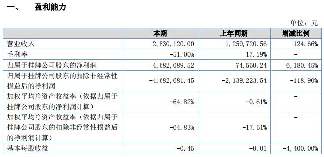 報告期內(nèi),公司實現(xiàn)營業(yè)收入 2,830,120.00 元,較上年同期增長 124.66%,主要原因系公司本期新增網(wǎng)絡(luò)主播經(jīng)紀和電子競技業(yè)務(wù),使公司營業(yè)收入較去年有所提升;歸屬于掛牌公司股東的凈利潤 -4,682,089.52 元,較上年同期減少 6,180.45%,主要原因系公司網(wǎng)絡(luò)主播經(jīng)紀、電子競技等新業(yè)務(wù)處于業(yè)務(wù)開拓初期,尚未全面展開,前期投入成本高、收益低,致使虧損增加。