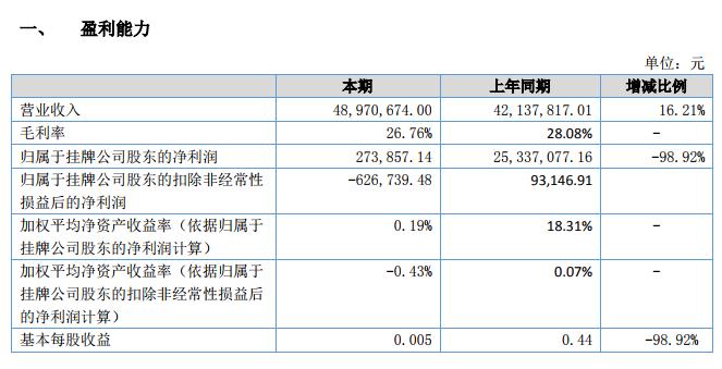 2018 年上半年,公司實(shí)現(xiàn)營(yíng)業(yè)收入 48,970,674.00 元,同比增長(zhǎng) 16.21%;利潤(rùn)總額和凈利潤(rùn)分別為 615,267.62 元、351,286.31 元,較去年同期分別下降 98.05 和 98.61%。截至 2018 年 6 月 30 日,公司總資產(chǎn)為 246,719,503.32 元,凈資產(chǎn)為 142,456,064.06 元。