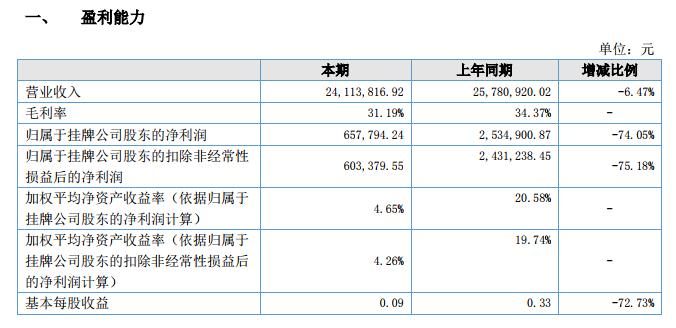 報(bào)告期內(nèi),營(yíng)業(yè)收入 24,113,816.92 元,同比減少 1,667,103.10 元,下降 6.47%。下降主要原因?yàn)楣緢?bào)告期內(nèi)國(guó)內(nèi)銷售同比增長(zhǎng) 21.84%,出口銷售同比下降 61.96%,系國(guó)外訂單正式下單較晚所致;營(yíng)業(yè)成本 16,593,260.77 元,同期下降 1.94%,主要系收入下降導(dǎo)致成本下降;凈利潤(rùn)為 657,794.24 元,同比減少 1,877,106.63 元,下降 74.05%,下降主要原因?yàn)閳?bào)告期內(nèi)出口銷售下降 61.96%,導(dǎo)致報(bào)告期收入下降,其他收益增值稅退還同比下降 50.30%。
