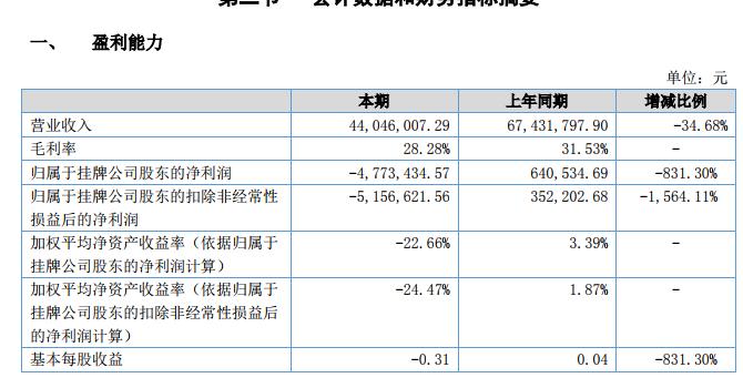 報告期內(nèi),公司實現(xiàn)營業(yè)收入 4,404.60 萬元,同比減少 34.68%。實現(xiàn)凈利潤-477.34 萬元,同比減少 845.23%。報告期內(nèi),因公司持續(xù)加大產(chǎn)品研發(fā)投入及積極推進(jìn)新產(chǎn)品上市計劃,致使經(jīng)營活動產(chǎn)生的現(xiàn)金流量凈額為-907.83 萬元,同比減少 203.09%;截止報告期末,公司總資產(chǎn)為 4,258.58 萬元,同比減少 6.12%,凈資產(chǎn)為 1,878.11 萬元,同比減少 19.96%。