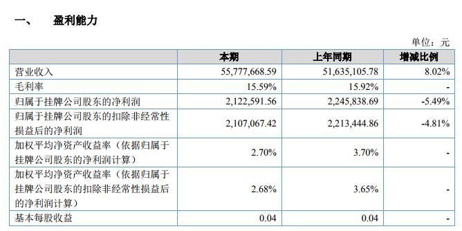報(bào)告期內(nèi)公司營業(yè)收入 55,777,668.59 元,與上年同期相比增長了 8.02%;銷售毛利率為 15.59%,與上年同期相比下降了 0.33 個(gè)百分點(diǎn);本期實(shí)現(xiàn)凈利潤 2,103,204.56 元,比上年同期相比減少了 7.08%。本期經(jīng)營活動(dòng)產(chǎn)生的現(xiàn)金流量凈額為-7,886,153.68 元,較上年同期減少了 3,969,375.03 元。