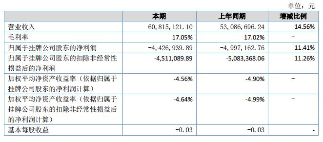 報告期內(nèi),公司營業(yè)收入為60,815,121.10元,較上年同期增長了14.56%,主要因為下游市場需求穩(wěn)步增長,優(yōu)質(zhì)客戶需求量增加以及國外市場的拓展使得業(yè)務(wù)量也有所提升。營業(yè)成本為50,449,154.64元,比上年同期增長了14.52%,與營業(yè)收入的增長基本一致。公司毛利率為17.05%,與上年同期基本持平。本期凈利潤為-4,501,226.08元,較上年同期減少了579,817.43元的虧損,主要原因是本期資產(chǎn)減值損失較上年同期減少680,483.06元。?