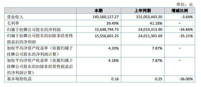 報(bào)告期內(nèi),公司營業(yè)收入14,556.01萬元,比上年同期減少3.64%;營業(yè)成本8,808.22萬元,比上年同期減少0.73%。凈利潤1,564.88萬元,比上年同期減少34.84%。?