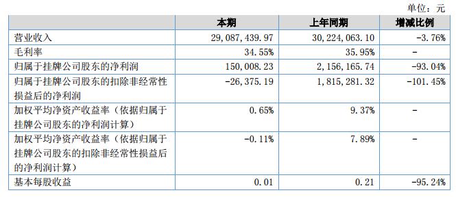 公司2018年上半年度實(shí)現(xiàn)為營(yíng)業(yè)收入2,908.74萬(wàn)元,較上年同期下降了3.76%;實(shí)現(xiàn)凈利潤(rùn)15.00萬(wàn)元,較上年同期下降了93.04%,凈利潤(rùn)下降的主要是同比營(yíng)業(yè)收入減少、銷售費(fèi)用增加等原因引起的。扣除非經(jīng)常性損益后的凈利潤(rùn)為-2.64萬(wàn)元,較上年同期下降了101.45%。報(bào)告期末總資產(chǎn)4,588.19萬(wàn)元,總資產(chǎn)增長(zhǎng)率為9.00%;凈資產(chǎn)2,320.01萬(wàn)元,凈資產(chǎn)的增長(zhǎng)率為0.65%;經(jīng)營(yíng)活動(dòng)產(chǎn)生的現(xiàn)金流量?jī)纛~69.29萬(wàn)元,比去年同期下降88.97%。?