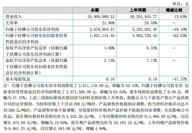 經(jīng)營(yíng)業(yè)績(jī)情況:報(bào)告期內(nèi)實(shí)現(xiàn)營(yíng)業(yè)收入55,908,000.19元,同比增長(zhǎng)13.63%;利潤(rùn)總額3,142,239.50元,同比降低48.42%;凈利潤(rùn)2,670,903.57元,同比降低49.43%。資產(chǎn)負(fù)債率為54.36%,總資產(chǎn)及凈資產(chǎn)分別同比增長(zhǎng)13.07%和31.15%。?