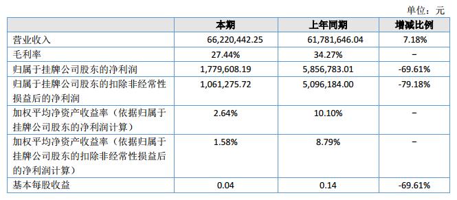 2018年上半年,公司實(shí)現(xiàn)營(yíng)業(yè)收入66,220,442.25元,公司本期營(yíng)業(yè)收入較上年同期增長(zhǎng)7.18%,主要原因是公司持續(xù)加強(qiáng)對(duì)下游客戶的銷售力度,公司高端產(chǎn)品的銷售規(guī)模有所提高,其收入占營(yíng)業(yè)收入的比重較上年度提升,推動(dòng)公司收入規(guī)模的增長(zhǎng)。公司實(shí)現(xiàn)利潤(rùn)總額1,903,673.20元,凈利潤(rùn)1,779,608.19元,凈利潤(rùn)較上年同期減少4,077,174.82元,同比下降69.61%?