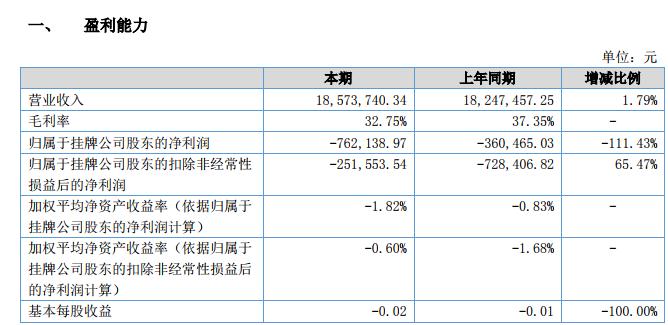 2018 年 1—6 月份,公司實現(xiàn)營業(yè)總收入 1,857.75 萬元,同比增長 1.79%;凈利潤為-76.21 萬元,同比減少 111.43%。截止 2018 年 6 月 30 日,公司總資產(chǎn)為 8,160.38 萬元,凈資產(chǎn)為 4,157.6 萬元,經(jīng)營活動產(chǎn)生的現(xiàn)金流量凈額 400.28 萬元。