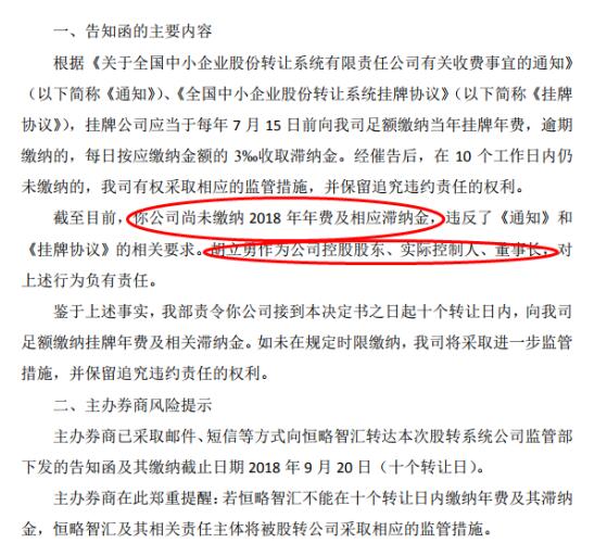 2018年9月14日,主辦券商光大證券發(fā)布風(fēng)險(xiǎn)提示公告,恒略智匯本應(yīng)該在2018年7月15日交掛牌費(fèi),至今未繳納。