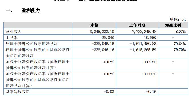 報(bào)告期內(nèi),公司實(shí)現(xiàn)營(yíng)業(yè)收入 8,345,333.10 元,虧損-328,046.16 元。公司目前盈利能力較弱,抗風(fēng)險(xiǎn)能力較差,若未來不能及時(shí)改善盈利能力,可能對(duì)公司經(jīng)營(yíng)發(fā)展產(chǎn)生不利影響。