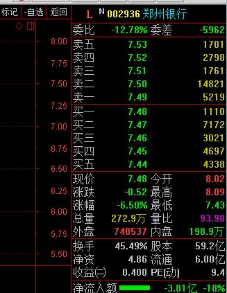 資料顯示,鄭州銀行發(fā)行價為4.59元/股,公司上市后迎來3個漲停板,9月21日收盤價為8元/股,今日開盤后一路走低,最終以7.48元/ 股收盤。按此計算,每個中簽用戶盈利位1445元,創(chuàng)下2016年新股信用申購制度實施以來,打中新股盈利最低的紀錄。鄭州銀行9月25日走勢圖