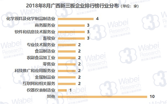 從行業(yè)分布來看,化學(xué)原料及化學(xué)制品制造業(yè)的企業(yè)數(shù)量最多,有4家企業(yè);其次是商務(wù)服務(wù)業(yè)、軟件和信息技術(shù)服務(wù)業(yè)、畜牧業(yè),均有3家企業(yè)。(來源:挖貝新三板研究院)