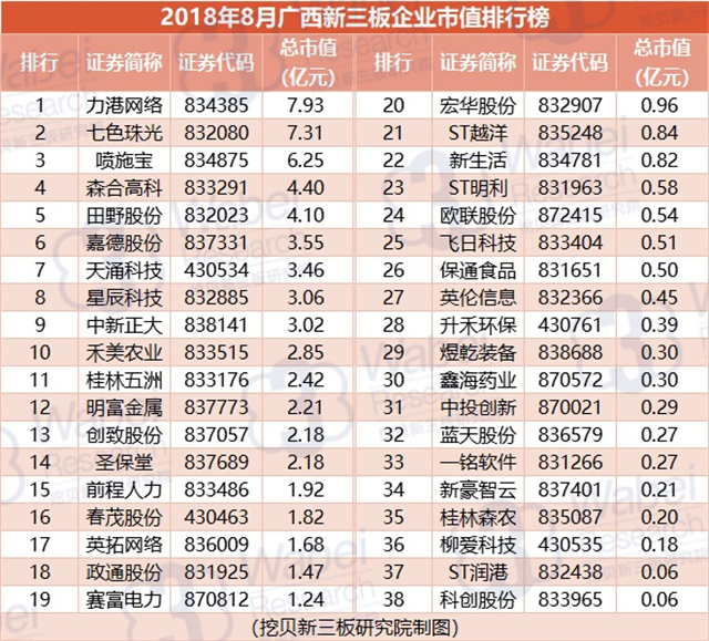 附:2018年8月廣西新三板企業(yè)市值排行榜