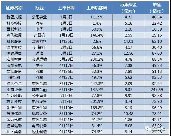 統(tǒng)計(jì)顯示,20家新三板公司,通過(guò)首次公開(kāi)發(fā)行,合計(jì)募資122億元(凈額),融資最多的科順股份14億元,最少的金力永磁也有1.86億元。