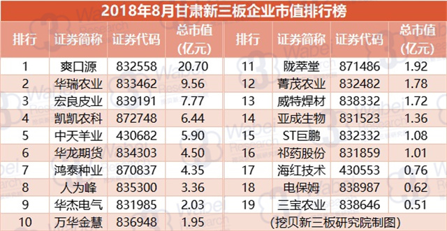 附:2018年8月甘肅新三板企業(yè)市值排行榜