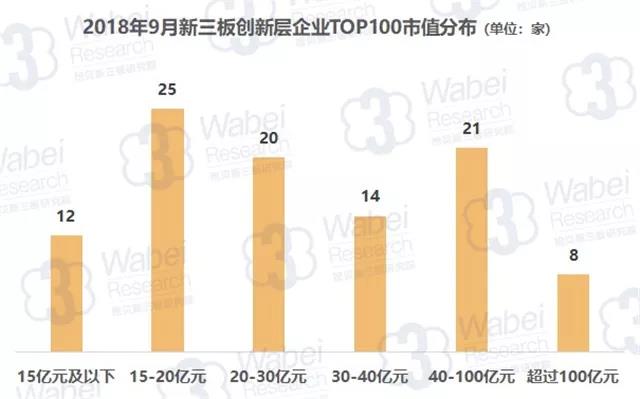 截止到2018年9月30日,新三板共有10946家掛牌公司,其中,創(chuàng)新層有933家企業(yè),占比8.5%。挖貝新三板研究院梳理出2018年9月全國(guó)新三板創(chuàng)新層企業(yè)市值TOP100(以下簡(jiǎn)稱(chēng):TOP100)。