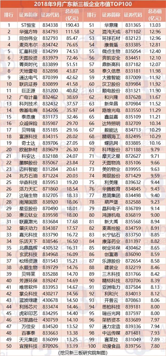 附:2018年9月廣東新三板企業(yè)市值TOP100
