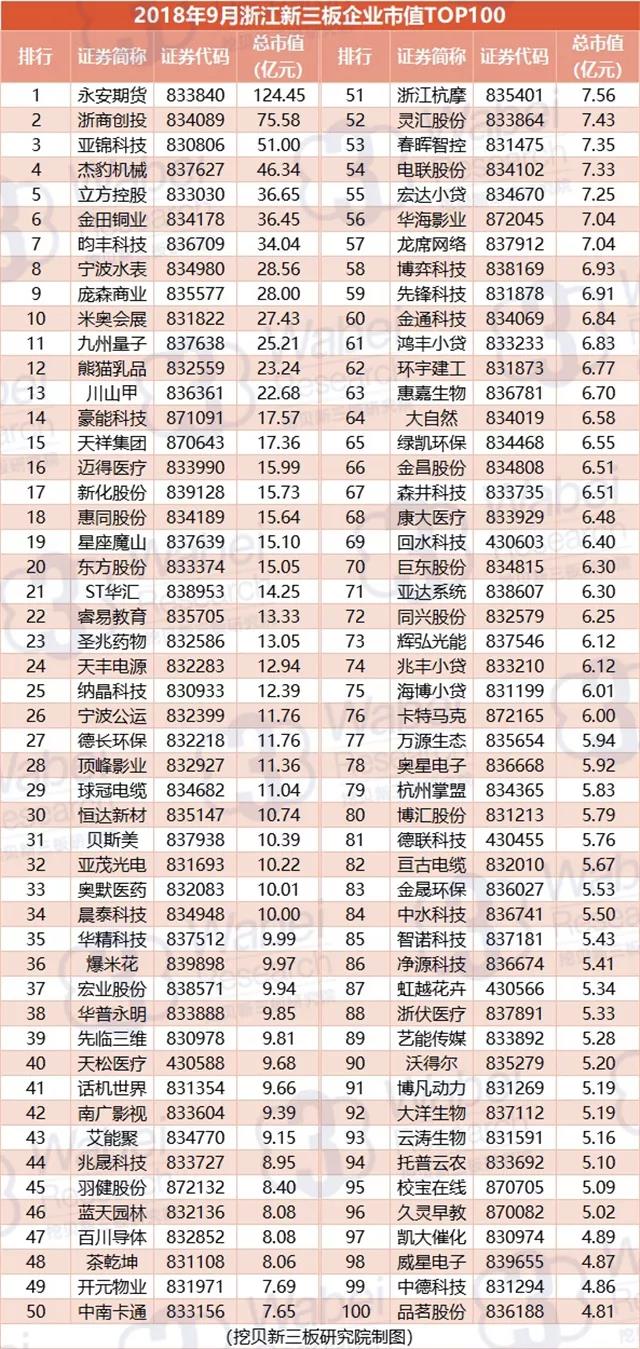附:2018年9月浙江新三板企業(yè)市值TOP100