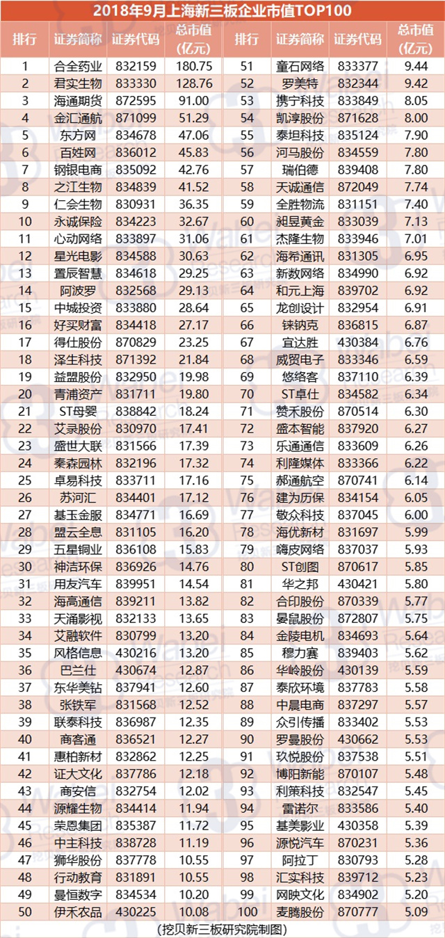 附:2018年9月上海新三板企業(yè)市值TOP100