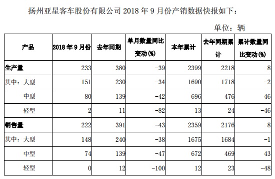 亞星客車最新發(fā)布的9月產(chǎn)銷數(shù)據(jù)快報(bào)顯示,9月,公司共生產(chǎn)汽車233輛,較去年同期下滑了39%,共銷售汽車222輛,較去年同期下滑了43%。