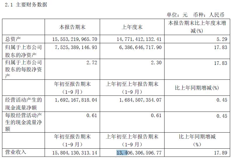 前三季度收入158億元,去年同期為134億元,同比增長17.89%;利潤為12.8億元,去年同期為9.96億元,同比增長28.21%;總資產(chǎn)155.5億元,去年同期為147.7億元,同比增長5.29%;歸屬于上市公司股東的凈資產(chǎn)75.25億元,同比增長17.83%。