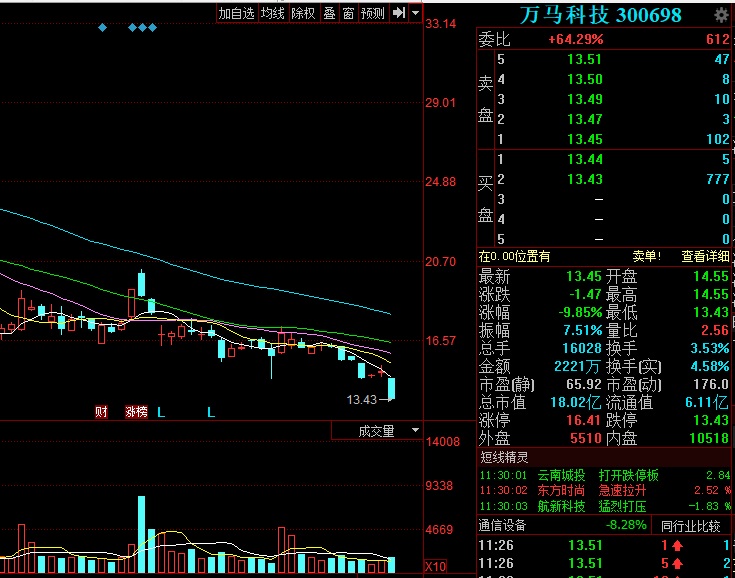 萬馬科技于2017年8月上市,上市后股價(jià)快速?zèng)_高,最高價(jià)為50.5元/股,隨后便震蕩向下。近日,萬馬科技股價(jià)跌至自去年10月以來的最低點(diǎn)。截至上午收盤,萬馬科技股價(jià)為13.45元/股,下跌9.85%,盤中股價(jià)觸及跌停。上午,萬馬科技共成交了1.6萬股,超昨全天成交量。
