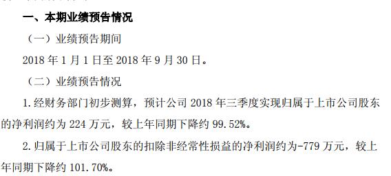 平高電氣稱,經(jīng)財(cái)務(wù)部門初步測(cè)算,預(yù)計(jì)公司 2018 年三季度實(shí)現(xiàn)歸屬于上市公司股東 的凈利潤(rùn)約為 224 萬(wàn)元,較上年同期下降約 99.52%;歸屬于上市公司股東的扣除非經(jīng)常性損益的虧損779 萬(wàn)元,較上年同期下降約 101.70%。