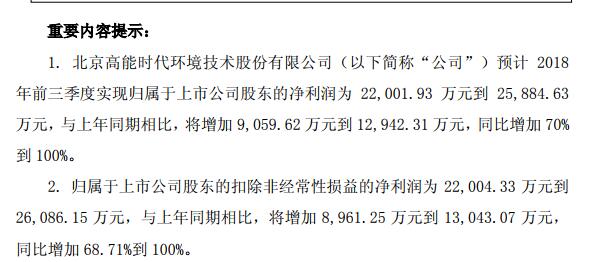 高能環(huán)境稱,經(jīng)公司財(cái)務(wù)部門(mén)初步測(cè)算,預(yù)計(jì) 2018 年前三季度利潤(rùn)在2.2億元-2.59億元之間,與上年同期相比,將增加 9,059.62 萬(wàn)元到1.29億元,同比增加 70%到 100%。