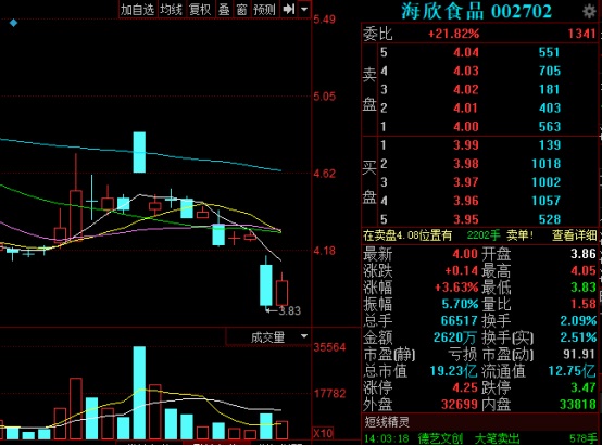 今日,海欣食品股價(jià)上漲,截至收盤,股價(jià)為4元/股,上漲了3.63%。
