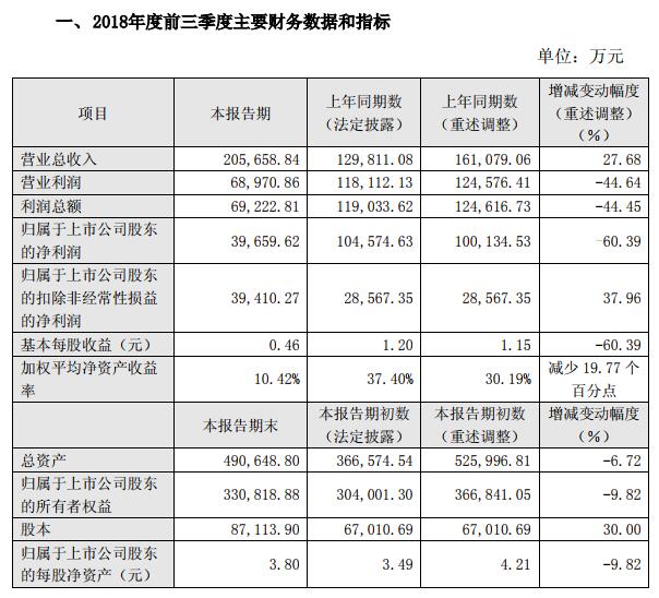 上年前三季度公司轉(zhuǎn)讓持有的北京北生研生物制品有限公司100%股權(quán)和長春祈健生物制品有限公司51%股權(quán),實(shí)現(xiàn)7.58億元的投資收益(稅后),主要受此影響,公司2018年前三季度同期(重述調(diào)整)對比,營業(yè)利潤、利潤總額、歸屬于上市公司股東的凈利潤、基本每股收益呈現(xiàn)較大幅度下降。
