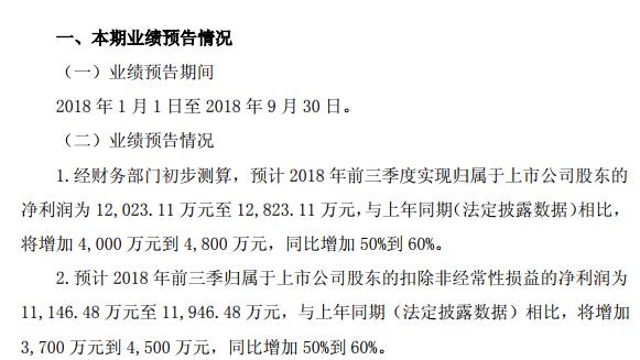 經財務部門初步測算,預計2018年前三季度凈利潤為12,023.11萬元至 12,823.11萬元,與上年同期8,023.11 萬元相比,將增加4,000萬元到4,800萬元,同比增加50%到60%。