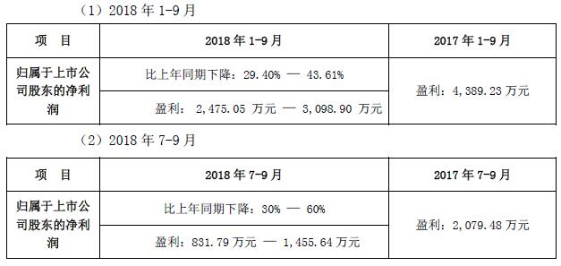 前三季度利潤為2,475.05 萬元-3,098.90 萬元,同比下降29.40%-43.61%,去年同期為4389.23萬元。