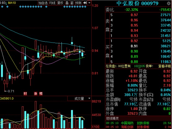 今明兩天,張永宏護(hù)衛(wèi)股價(jià)任務(wù)艱巨。今日,中弘股份0.92元/股開盤,漲1.10%