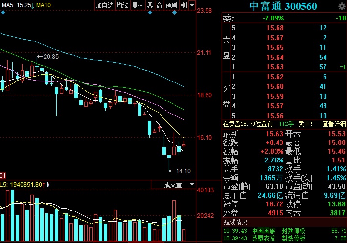 今日,中富通股票高開并保持高位震蕩,截至發(fā)稿,股價(jià)為15.63元/股,漲2.83%。